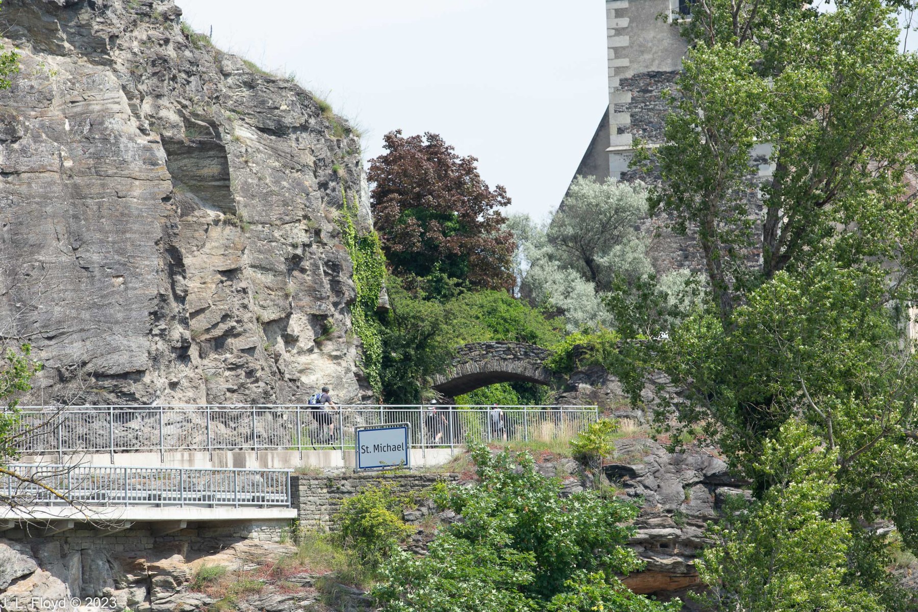 All too soon it was time to return to the Monarch Queen, which was about to begin the long journey to its next port of Aschach, the jumpoff point for the excursion to Salzburg. We climbed the same grand staircase which we had descended from the parking lot, and were bid farewell by the parting admonition carved in the stone in the midst of the steps: “Ankommen und du wirst H
