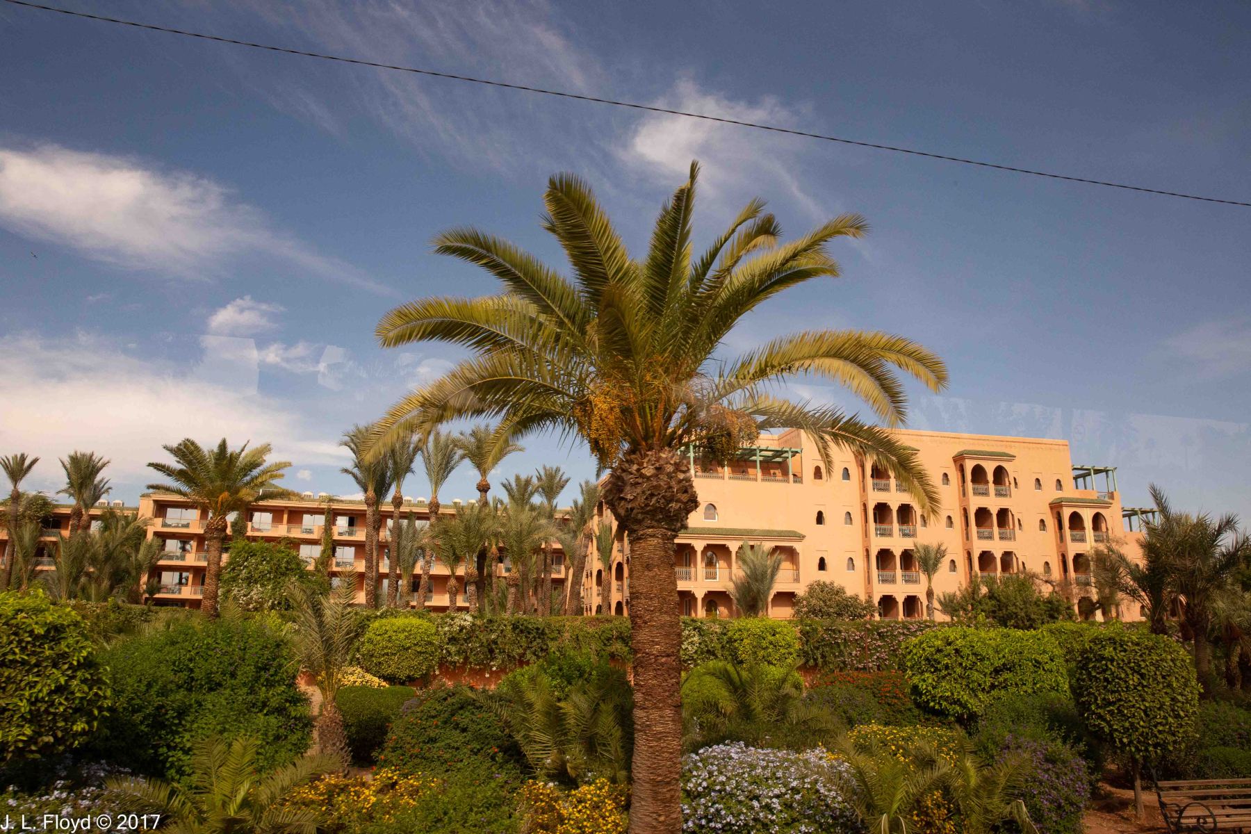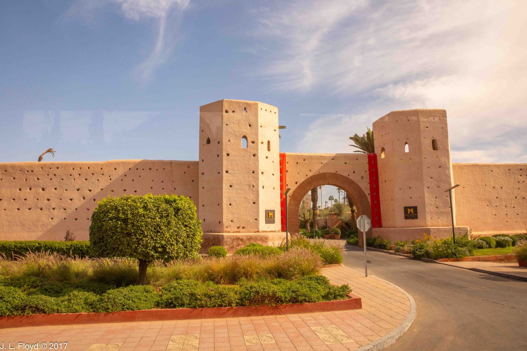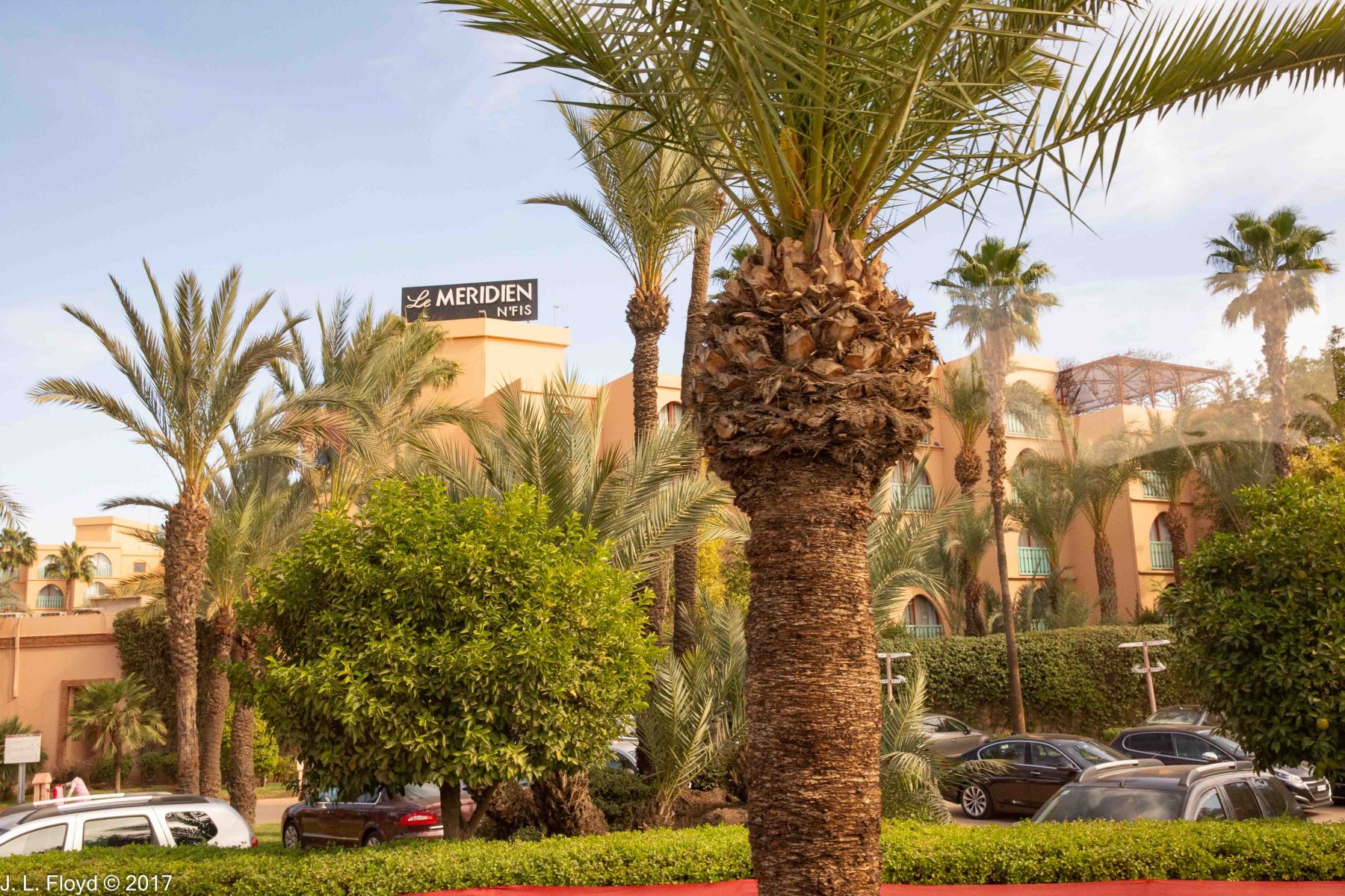 Our hotel, called Le Meridien N’Fis, was situated not far outside the old walls, on Boulevard Mohammed VI near the corner of Rue Moulay Rachid, about 3 km south-west of the Marrakesh Medina. Across the boulevard was a major ultra-modern mall, the Menara, and south of Moulay Rachid were two large parks. It was hard to get a good photo of the hotel because of the vegetation surrounding it, which blocked the view. I couldn’t seem to find a vantage point that didn’t have a large palm tree blocking the view.
