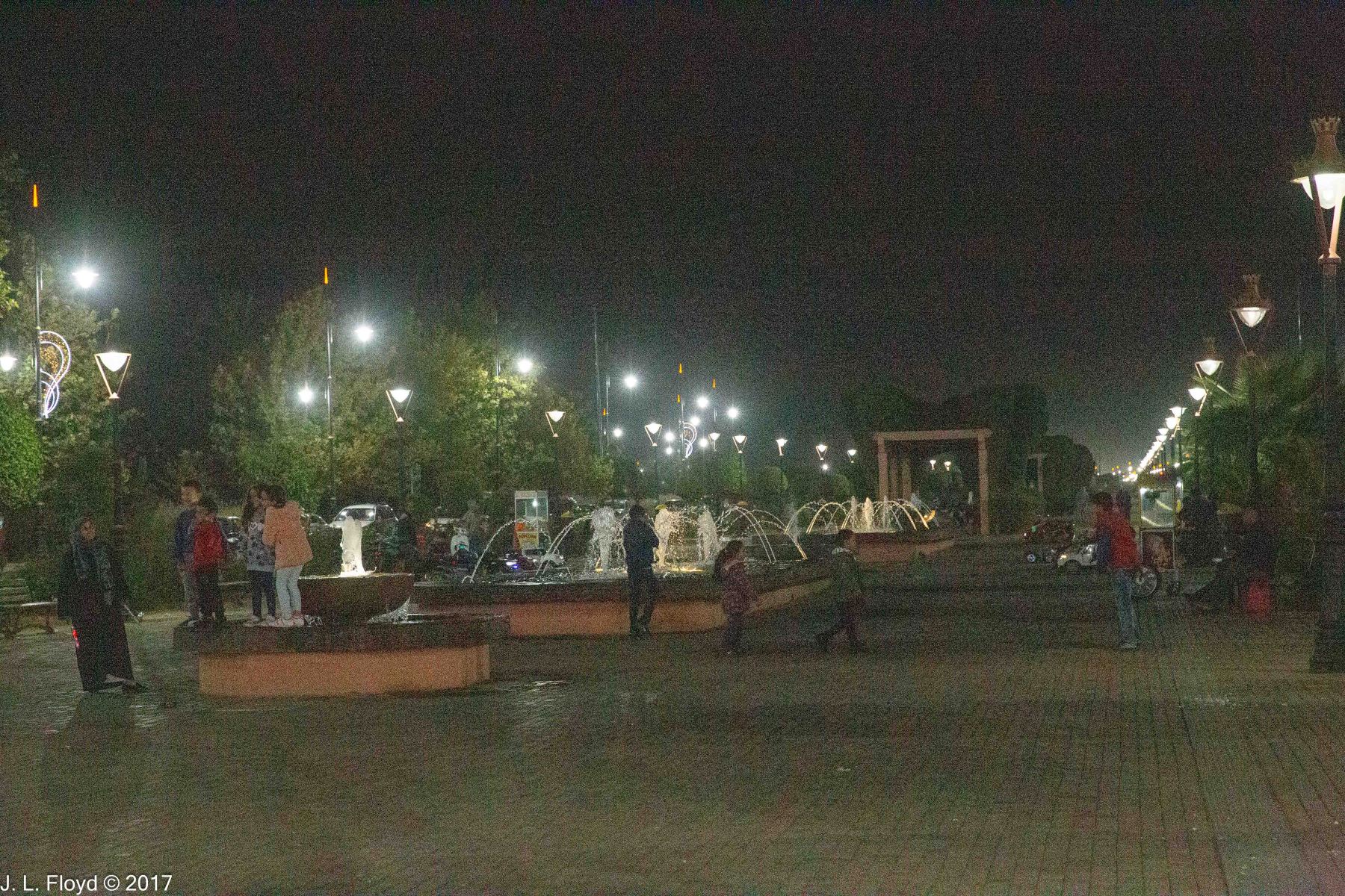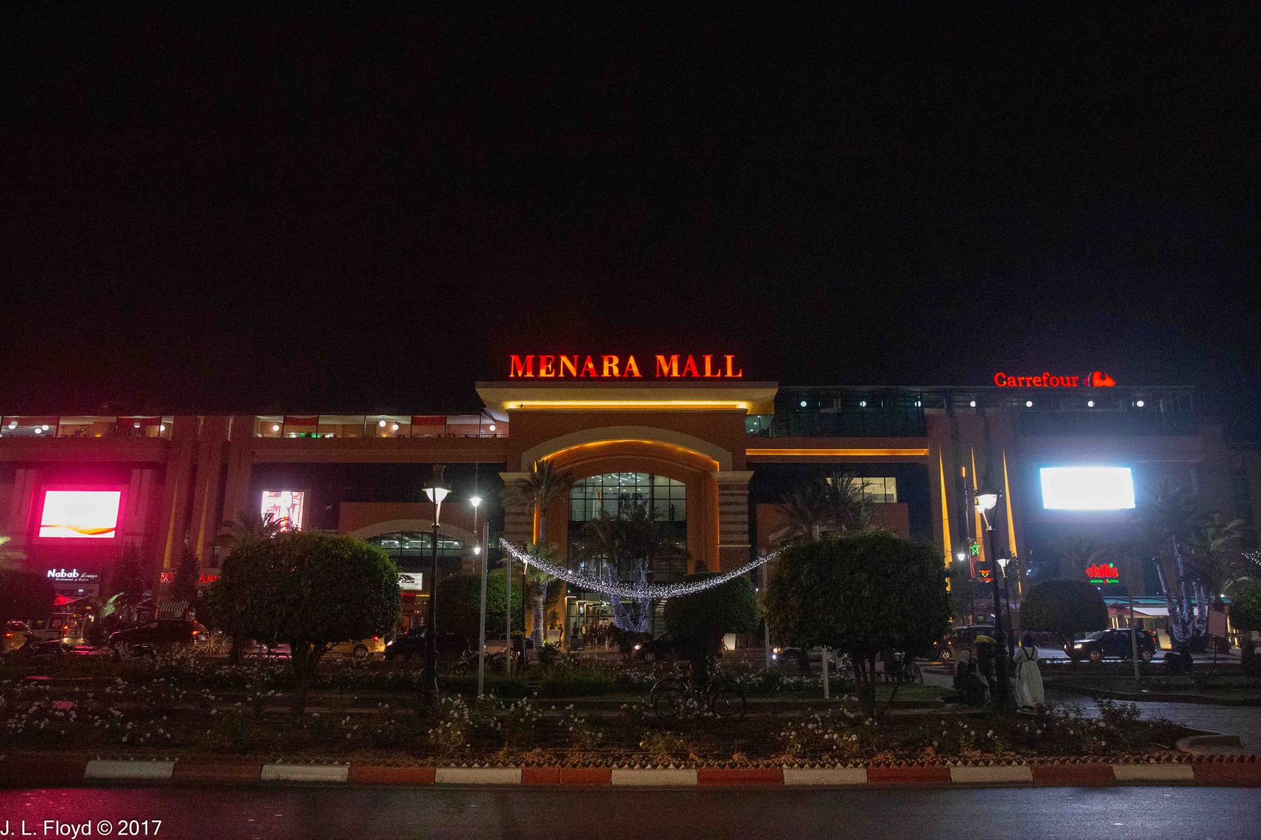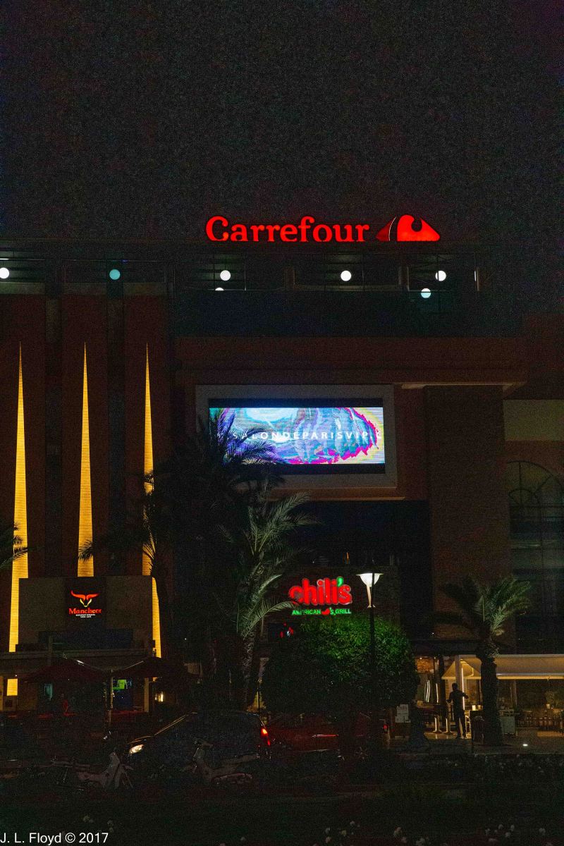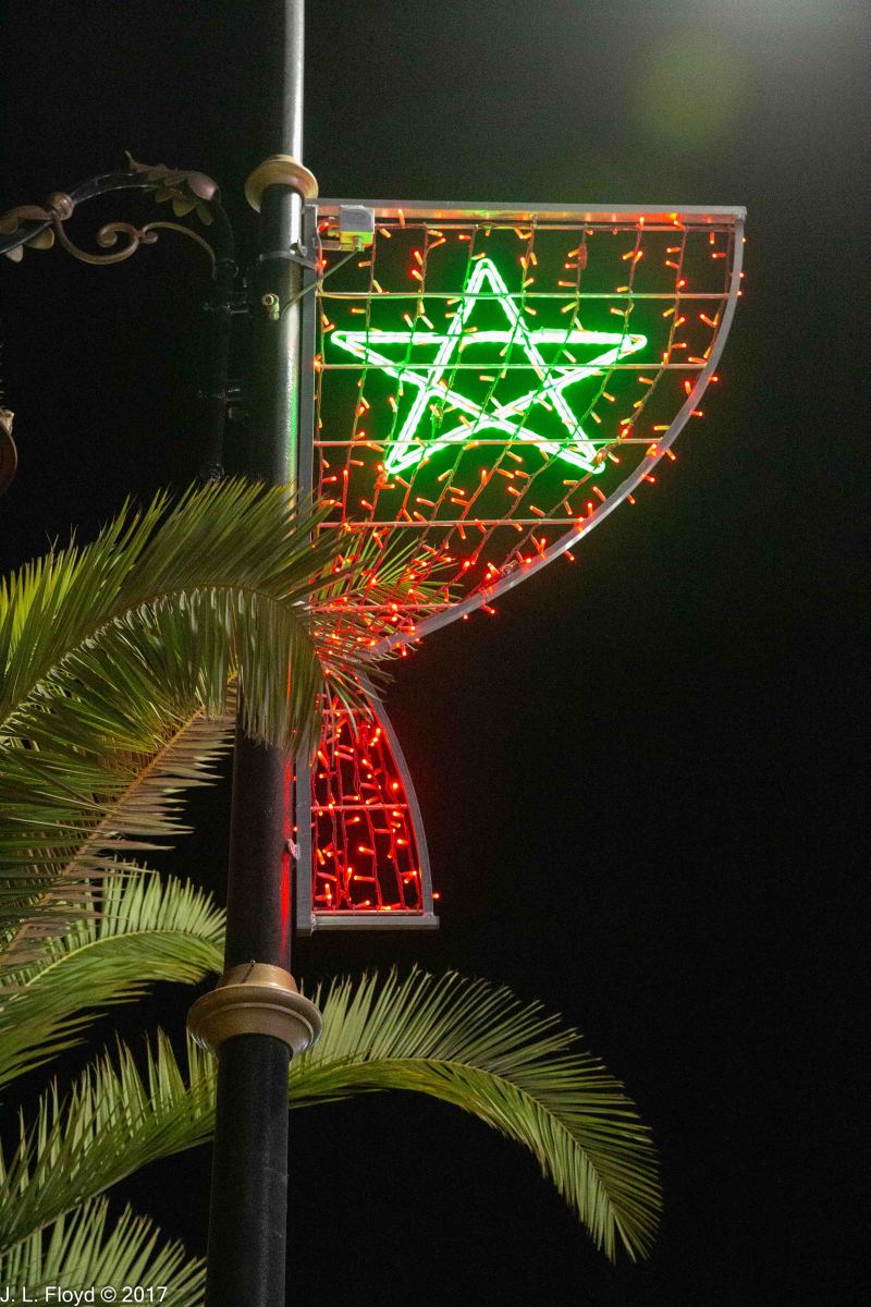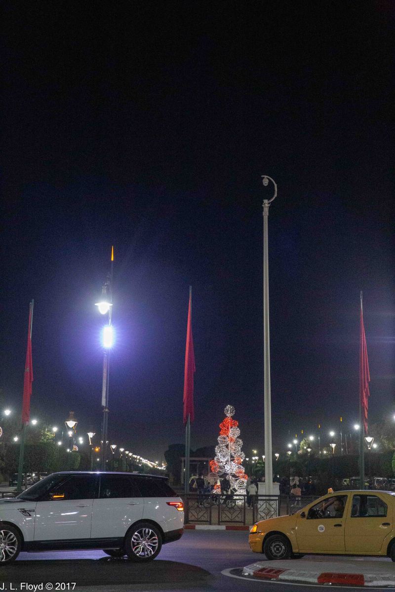 On our second evening in Marrakesh, not being ready to fall asleep yet, I went for an after-dinner walk in the hotel vicinity with my Canon EOS-6D and took some pictures of the area. I was surprised to find that after dark this part of Marrakesh felt more like a city in the southwestern USA at Christmas time than an Islamic country in Africa. The Menara Mall across the boulevard from the hotel reminded me in particular of malls in Los Angeles or Las Vegas. To enhance the holiday atmosphere, the street lights were festooned with something that looked like Christmas decorations.