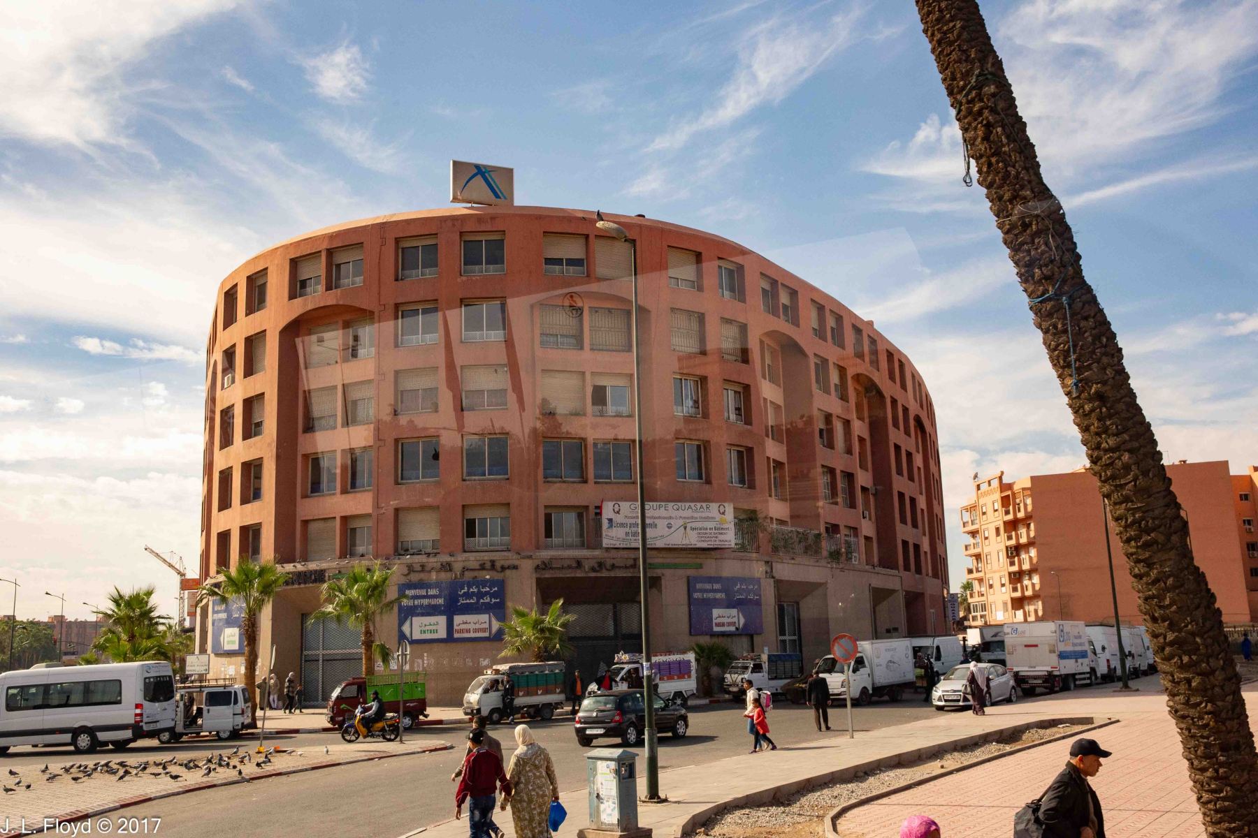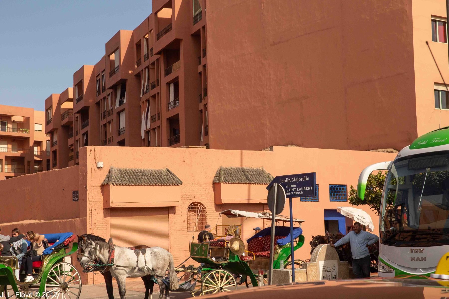 By the time our bus delivered us to our hotel in Marrakesh, on the evening of November 14, 2017, it was already too late, and we were too exhausted, to do anything except eat dinner and retire to our rooms. Our schedule for the following day, November 15, was quite full and left us no free time to go exploring on our own, except late that night. There was also a little time for free-lance discovery on the morning of November 16, after visiting the Jardin Majorelle. I took advantage of these brief opportunities, but they were limited mostly to scenes of the immediate area around our hotel and a few candid street shots from the bus while en route to and from the hotel. Although I shot these photos toward the end of our stay in Marrakesh, they are more suitable for an introduction than a conclusion, so – following a brief preface on the history and character of the city – I’ll begin with them and save the epic adventures of the following two days for the next few posts.